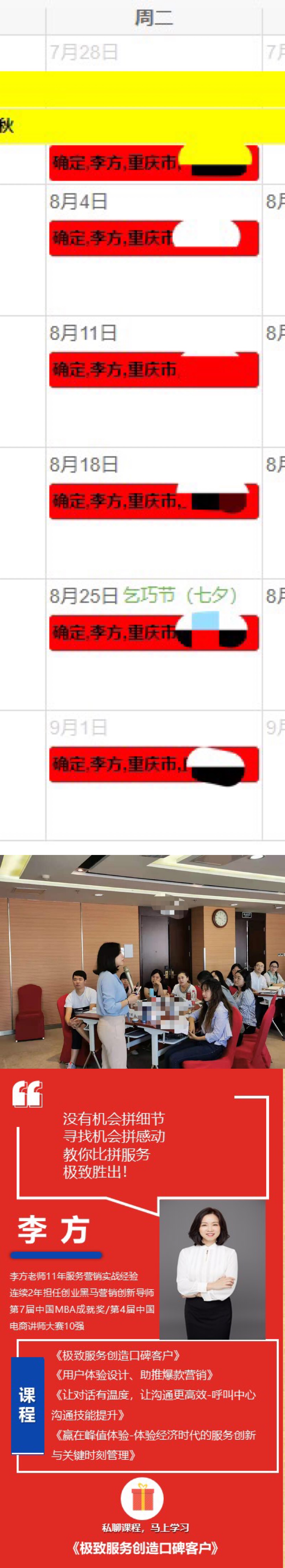 服务营销李方老师7月7日给重庆轨交讲《360度企业全方位服务意识提升》圆满结束!!!一期课程返聘10期!!!持续到9月份 11年服务营销实战经验 连续2年担任创业黑马营销创新导师 第7届中国MBA成就奖/第4届中国电商讲师大赛10强 3类课程: (1)服务营销 (2)服务设计 (3)服务管理 4大行业: (1)金融服务(银行、证券) (2)公共服务(电力、燃气) (3)互联网企业 (电商) (4)传统零售行业(百货、珠宝) 欢迎约课