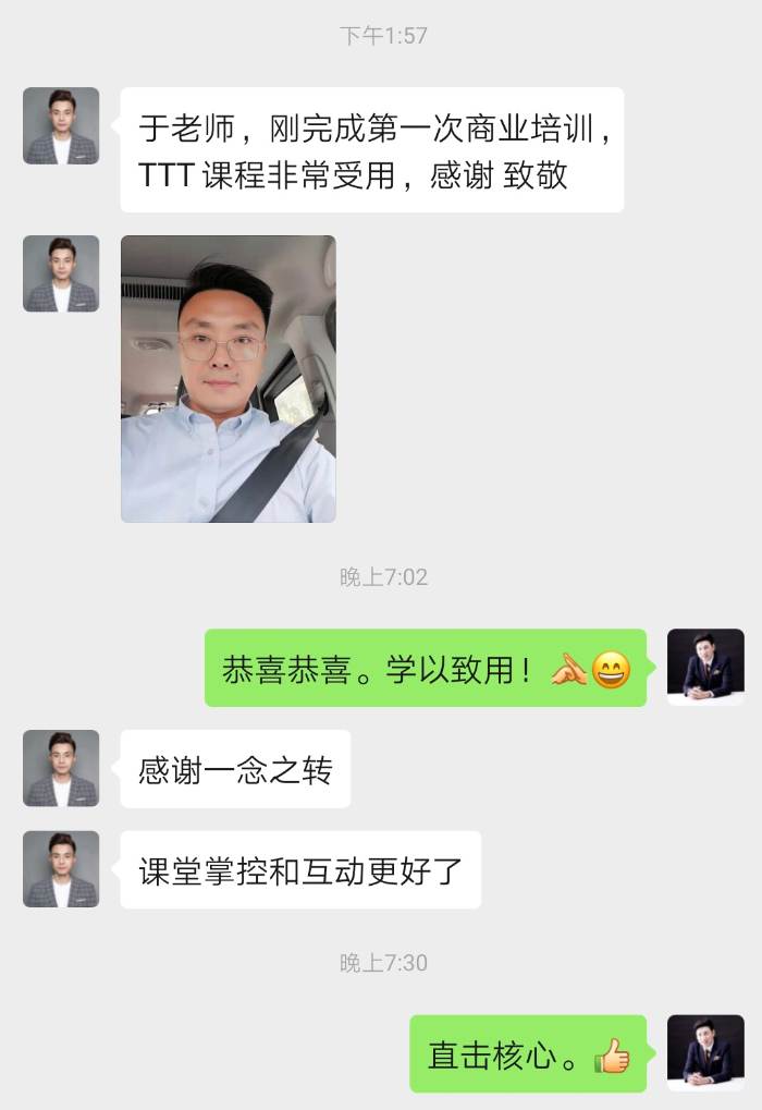 “无一人看手机 学员笑声不断 人人收获成果 不是广告词,是真的做到了,厉害 ” 这是河北廊坊银行的学员上完于沣然老师的《TTT风采卓然——培训师授课技巧与呈现》课程后给予的反馈 从课前的需求调研到课程的技巧展现,于老师一直在很用心地对待! 而学员们的精神状态从始至终也极佳,享受其中!